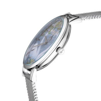 Silver-tone stainless steel case with a silver-tone stainless steel mesh bracelet. Fixed silver-tone stainless steel bezel. Gray dial with silver-tone hands and Roman numeral and index hour markers. Dial Type: Analog. Quartz movement. Scratch resistant solidified crystal mineral crystal. Push/pull crown. Solid case back. Round case shape, case size: 38 mm, case thickness: 9 mm. Band width: 14 mm, band length: 7.5 inches. Foldover clasp. Water resistant at 30 meters / 99 feet. Functions: hour, minute, second. Casual watch style. Johan Eric Knoppsvane Ladies Watch JE2500-04-003B.