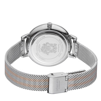 Silver-tone stainless steel case with a silver-tone stainless steel mesh bracelet. Fixed silver-tone stainless steel bezel. Gray dial with gold-tone hands and Arabic numeral and index hour markers. Dial Type: Analog. Quartz movement. Scratch resistant solidified crystal mineral crystal. Push/pull crown. Solid case back. Round case shape, case size: 38 mm, case thickness: 9 mm. Band width: 14 mm, band length: 7.5 inches. Foldover clasp. Water resistant at 30 meters / 99 feet. Functions: hour, minute, second. Casual watch style. Johan Eric Knoppsvane Ladies Watch JE2500-11-003B.