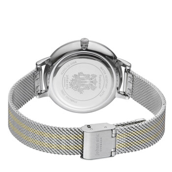Silver-tone stainless steel case with a two-tone (silver-tone and gold-tone) stainless steel mesh bracelet. Fixed silver-tone stainless steel bezel. Gray dial with gold-tone hands and Arabic numeral and index hour markers. Dial Type: Analog. Quartz movement. Scratch resistant solidified crystal mineral crystal. Push/pull crown. Solid case back. Round case shape, case size: 38 mm, case thickness: 9 mm. Band width: 14 mm, band length: 7.5 inches. Foldover clasp. Water resistant at 30 meters / 99 feet. Functions: hour, minute, second. Casual watch style. Johan Eric Knoppsvane Ladies Watch JE2500-12-003B.