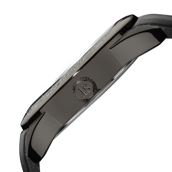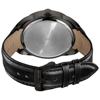 Black base metal case with a black leather strap. Fixed black base metal bezel showing tachymeter markings. Matt black dial with luminous silver-tone hands and index hour markers. An Arabic numeral appears at the 12 o'clock position. Minute markers around the outer rim. Dial Type: Analog. Luminescent hands and markers. Three multi-function sub-dials displaying: 24 hours, date and day of the week. Quartz movement. Scratch resistant mineral crystal. Pull / push crown. Snap down case back. Round case shape. Case size: 45 mm. Case thickness: 11 mm. Band width: 22 mm. Band length: 8 inches. Tang clasp. Water resistant at 30 meters / 100 feet. Functions: hour, minute, second. Additional Info: subdials: three, GMT, date, day. Casual watch style. Item Variations: JS 45 BK, JS.45.BK, JS45BK. Joshua and Sons Black Dial Black Leather Men's Watch JS-45-BK.