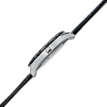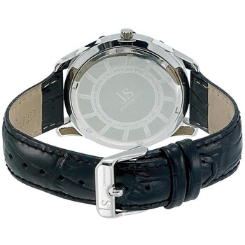 Stainless steel case with a black (calfskin) leather strap. Fixed black ion-plated bezel set with crystals. Black mother of pearl (crystal-set) dial with luminous silver-tone arrow-shaped hands and diamond hour markers. Arabic numerals mark the 3, 6, 9 and 12 o'clock positions. Dial Type: Analog. Luminescent hands. Quartz movement. Scratch resistant mineral crystal. Pull / push crown. Screw down case back. Round case shape. Case size: 31 mm. Case thickness: 13 mm. Band width: 18.5 mm. Band length: 9 inches. Tang clasp. Water resistant at 50 meters / 165 feet. Functions: hour, minute, second. Dress watch style. Watch label: Swiss Quartz. Item Variations: JS 17 SS, JS.17.SS, JS17SS. Joshua And Sons Black Mother of Pearl Men's Watch JS-17-SS.