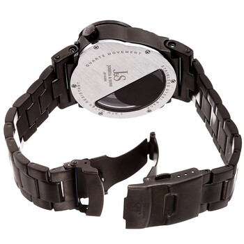 Black-plated composite metal case with a black-plated stainless steel bracelet. Fixed black-plated composite metal bezel. Black dial with luminous silver-tone hands and index hour markers. Minute markers around the outer rim. Dial Type: Analog. Luminescent hands. Dual time 12 hour display displayed on rotating discs. Quartz movement. Scratch resistant mineral crystal. Pull / push crown. Solid case back. Round case shape. Case size: 44 mm. Case thickness: 13 mm. Band width: 21 mm. Band length: 8.25 inches. Fold over clasp with a safety release. Water resistant at 30 meters / 100 feet. Functions: dual time, hour, minute, second. Fashion watch style. Joshua and Sons Dual Time Quartz Black Dial Men's Watch JX143BK.
