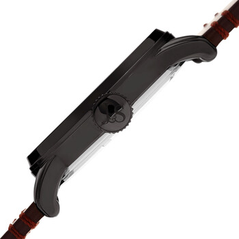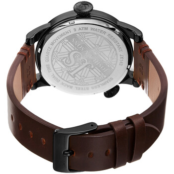 Black-plated composite metal case with a brown leather strap. Fixed black-plated composite metal bezel. Blue dial with black hands and Arabic numeral hour markers. Minute markers around the outer rim. Dial Type: Analog. Two white sub-dials displaying: 12 hour (dual time) and small second. Quartz movement. Scratch resistant mineral crystal. Pull / push crown. Solid case back. Round case shape. Case size: 49 mm. Case thickness: 12 mm. Band width: 24 mm. Band length: 8.5 inches. Tang clasp. Water resistant at 30 meters / 100 feet. Functions: dual time, hour, minute, seconds. Fashion watch style. Joshua and Sons Dual Time Quartz Blue Dial Men's Watch JX142GNBR.