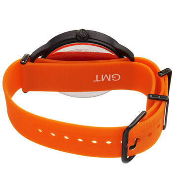 Black-plated composite metal case with a orange silicone strap. Fixed black-plated composite metal bezel. Black dial with luminous silver-tone hands and Arabic numeral 24 hour (GMT scale) hour markers. Arabic numeral minute markers (at 5 minute intervals). Minute markers around the outer rim. Dial Type: Analog. Luminescent hands. Date display at the 3 o'clock position. Quartz movement. Scratch resistant mineral crystal. Pull / push crown. Solid case back. Round case shape. Case size: 40 mm. Case thickness: 9 mm. Band width: 18 mm. Band length: 7.5 inches. Tang clasp. Water resistant at 30 meters / 100 feet. Functions: date, GMT, hour, minute, second. Fashion watch style. Joshua and Sons GMT Black Dial Men's Watch JX147OR.