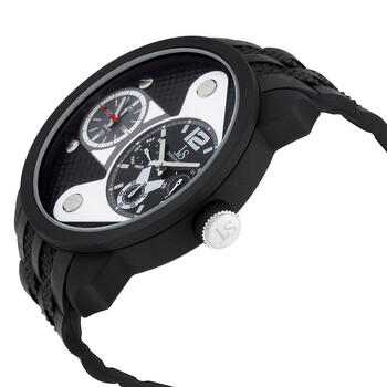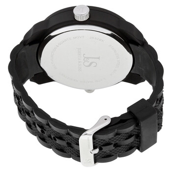 Black ion-plated base metal case with a black silicone strap. Fixed black ion-plated base metal bezel. Black textured dial with luminous silver-tone hands and index hour markers. An Arabic numeral appears at the 12 o'clock position. Minute markers around the outer rim. Dial Type: Analog. Luminescent hands and markers. Three multi-function sub-dials displaying: 60 seconds, date and day of the week. 24 hour (second time zone). Quartz movement. Scratch resistant mineral crystal. Pull / push crown. Screw down case back. Round case shape. Case size: 52 mm. Case thickness: 13 mm. Band width: 24 mm. Band length: 9 inches. Tang clasp. Water resistant at 30 meters / 100 feet. Functions: GMT, second time zone, hour, minute, second. Casual watch style. Joshua and Sons Multi-Function Black Dial Black Silicone Men's Watch JS52BK.
