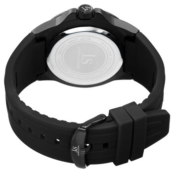 Black-plated composite metal case with a black silicone strap. Fixed black-plated composite metal bezel. Black dial with luminous silver-tone hands and index hour markers. Arabic numerals mark the 3, 6, 9 and 12 o'clock positions. Minute markers around the outer rim. Dial Type: Analog. Luminescent hands and markers. Date display at the 4 o'clock position. Quartz movement. Scratch resistant mineral crystal. Pull / push crown. Solid case back. Round case shape. Case size: 49 mm. Case thickness: 15 mm. Band width: 30 mm. Band length: 8.5 inches. Tang clasp. Water resistant at 30 meters / 100 feet. Functions: date, hour, minute, second. Fashion watch style. Joshua and Sons Quartz Black Dial Black Silicone Men's Watch JX115BK.