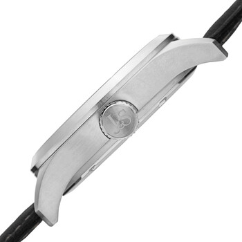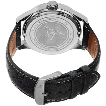 Silver-tone alloy case with a black leather strap. Fixed silver-tone alloy bezel. Black (deep set) dial with luminous silver-tone hands and Arabic numeral hour markers. Minute markers around the outer rim. Dial Type: Analog. Luminescent hands and markers. Quartz movement. Scratch resistant mineral crystal. Pull / push crown. Solid case back. Round case shape. Case size: 44 mm. Case thickness: 11.8 mm. Band width: 22 mm. Band length: 8.25 inches. Tang clasp. Water resistant at 30 meters / 100 feet. Functions: date, hour, minute, second. Fashion watch style. Joshua and Sons Quartz Black Dial Ladies Watch JX150SSB.