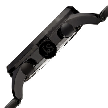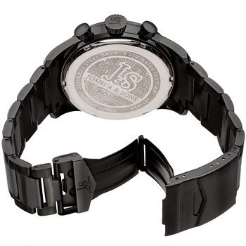 Black-plated composite metal case with a black-plated stainless steel bracelet. Fixed black-plated composite metal bezel. Black dial with luminous silver-tone hands and index hour markers. An Arabic numeral appears at the 12 o'clock position. Minute markers around the outer rim. Dial Type: Analog. Luminescent hands and markers. Date display between the 4 and 5 o'clock positions. Chronograph - three sub-dials displaying: 60 minute, 60 second and 24 hour. Quartz movement. Scratch resistant Hardlex crystal. Pull / push crown. Solid case back. Round case shape. Case size: 46 mm. Case thickness: 13.45 mm. Band width: 24 mm. Band length: 8.5 inches. Fold over clasp with a safety release. Water resistant at 30 meters / 100 feet. Functions: date, hour, minute, second. Fashion watch style. Joshua and Sons Quartz Black Dial Men's Watch JX134BK.