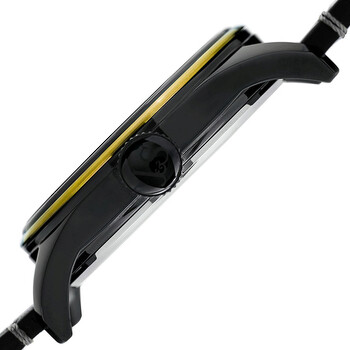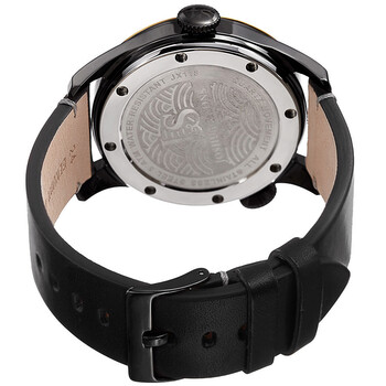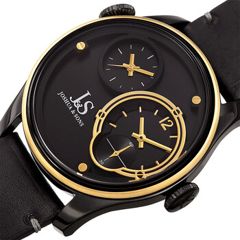 Black-plated stainless steel case with a black leather strap. Fixed black-plated bezel with a gold-tone ring. Black (dual time) dial. Dial Type: Analog. Small seconds sub-dial. Quartz movement. Scratch resistant mineral crystal. Pull / push crown. Solid case back. Round case shape. Case size: 46 mm. Case thickness: 12 mm. Band width: 24 mm. Tang clasp. Water resistant at 50 meters / 165 feet. Functions: hour, minute, second. Sport watch style. Joshua and Sons Quartz Black Dual Time Dial Men's Watch JX118BKYG.