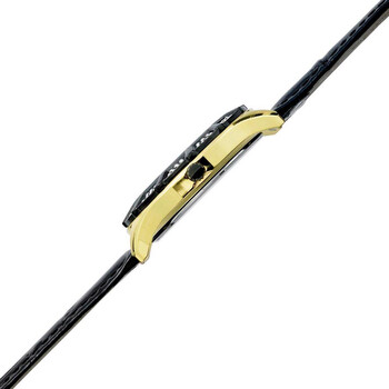 Yellow gold-tone stainless steel case with a black (calfskin) leather strap. Fixed black ion-plated bezel set with crystals. Black mother of pearl (crystal-set) dial with luminous silver-tone arrow hands and diamond hour markers. Arabic numerals mark the 3, 6, 9 and 12 o'clock positions. Dial Type: Analog. Luminescent hands. Quartz movement. Scratch resistant mineral crystal. Pull / push crown. Solid case back. Round case shape. Case size: 31 mm. Case thickness: 13 mm. Band width: 18.5 mm. Band length: 9 inches. Tang clasp. Water resistant at 50 meters / 165 feet. Functions: hour, minute, second. Dress watch style. Watch label: Swiss Quartz. Item Variations: JS 17 YG, JS.17.YG, JS17YG. Joshua and Sons Quartz Diamond Crystal Men's Watch JS-17-YG.