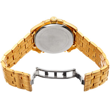 Yellow gold-tone composite metal case with a yellow gold-tone stainless steel bracelet. Fixed yellow gold-tone composite metal bezel. Gold (triple time) dial. Dial Type: Analog. Quartz movement. Scratch resistant sapphire crystal. Pull / push crown. Solid case back. Round case shape. Case size: 46 mm. Case thickness: 11 mm. Band width: 22 mm. Band length: 8 inches. Hidden fold over clasp. Water resistant at 30 meters / 100 feet. Functions: hour, minute, second. Fashion watch style. Joshua and Sons Quartz Gold (Triple Time) Dial Men's Watch JX128YG.
