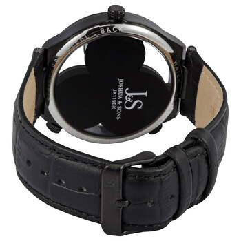 Black alloy case with a black leather strap. Fixed black alloy bezel. Black see through (three time zone) dial. Dial Type: Analog. Quartz movement. Scratch resistant Krysterna crystal. Pull / push crown. Transparent case back. Round case shape. Case size: 46 mm. Case thickness: 12 mm. Band width: 22 mm. Tang clasp. Water resistant at 10 meters / 33 feet. Functions: hour, minute, second, triple time zone. Casual watch style. Watch label: Japan Movt. Joshua Sons Black See Through Dial Men's Watch JX119BK.