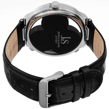 Silver-tone alloy case with a black (croco-embossed) leather strap. Fixed silver-tone alloy bezel. Grey see through (three time) dial with silver-tone hands. Dial Type: Analog. Quartz movement. Scratch resistant Krysterna crystal. Pull / push crown. Transparent case back. Round case shape. Case size: 46 mm. Case thickness: 12 mm. Band width: 24 mm. Tang clasp. Water resistant at 10 meters / 33 feet. Functions: hour, minute, second, triple time zone. Casual watch style. Watch label: Japan Movt. Joshua Sons Grey See Through Dial Men's Watch JX119GY.