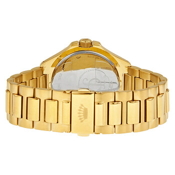 Gold-plated stainless steel case and bracelet. Fixed gold-plated bezel set with Swarovski crystals. Gold dial with gold-tone hands and index hour markers. Arabic numerals mark the 3, 6, 9 and 12 o'clock positions. Minute markers around the outer rim. Dial Type: Analog. Luminescent hands and markers. Quartz movement. Scratch resistant mineral crystal. Solid case back. Case diameter: 38 mm. Case thickness: 10.2 mm. Round case shape. Band width: 19 mm. Deployment clasp with push button release. Water resistant at 30 meters / 100 feet. Functions: hour, minute, second. Dress watch style. Watch label: Japan Movt. Juicy Couture Jetsetter Gold Dial Gold-Plated Stainless Steel Swarovski Crystal Ladies Watch 1900959.