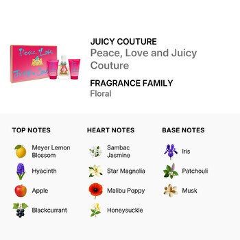Designed for the modern woman who loves to express her individuality, Peace, Love and Juicy Couture is more than a fragrance—it's a celebration of free-spirited femininity. Available exclusively for shipping in the Contiguous United States and Canada. Barcode: 719346135962.