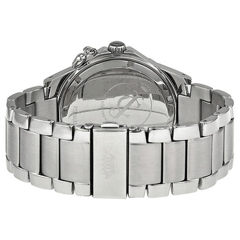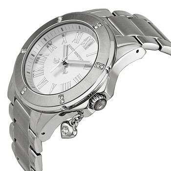 Stainless steel case with a stainless steel bracelet. Fixed stainless steel bezel set with Swarovski crystals and attched heart charm. Silver dial with luminous silver-tone hands and Roman numeral hour markers. Dial Type: Analog. Quartz movement. Scratch resistant Mineral crystal. Solid case back. Case diameter: 41 mm. Case thickness: 10.7 mm. Round case shape. Band width: 22 mm. Deployment clasp with push button. Water resistant at 30 meters / 100 feet. Functions: hour, minute, second. Dress watch style. Watch label: Japan Movt. Juicy Couture Rich Girl Silver Dial Stainless Steel Ladies Watch 1900893.