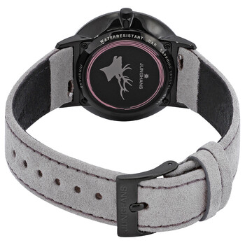 Black stainless steel case with a grey leather strap. Fixed black stainless steel bezel. Black dial with silver-tone hands and index hour markers. Dial Type: Analog. Luminescent hands and markers. Date display at the 3 o'clock position. Junghans Calibre J645.36 quartz movement. Scratch resistant sapphire crystal. Pull / push crown. Solid case back. Round case shape, case size: 34.1 mm, case thickness: 7 mm. Tang clasp. Water resistant at 50 meters / 165 feet. Functions: date, hour, minute, second. Form Damen Series. Casual watch style. Watch label: Made in Germany. Junghans Form Damen Quartz Black Dial Ladies Watch 47/4256.00.