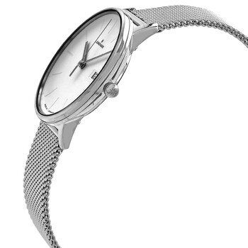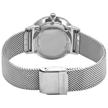 Stainless steel case with a stainless steel mesh bracelet. Fixed stainless steel bezel. White dial with silver-tone hands and index hour markers. Minute markers around the outer rim. Dial Type: Analog. Luminescent hands. Date display at the 3 o'clock position. Junghans calibre J645.36 quartz movement. Scratch resistant sapphire crystal. Pull / push crown. Screwed case back. Round case shape. Case size: 34 mm. Case thickness: 7 mm. Band width: 18 mm. Fold over slip through clasp. Water resistant at 50 meters / 165 feet. Functions: date, hour, minute, second. Casual watch style. Watch label: Made in Germany. Junghans Quartz White Dial Ladies Watch 047/4851.44.