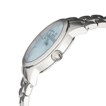Stainless steel case with a stainless steel bracelet. Fixed stainless steel bezel. Blue dial with silver-tone hands and index hour markers. Dial Type: Analog. Quartz movement. Scratch resistant mineral crystal. Pull / push crown. Solid case back. Round case shape. Case size: 36 mm. Case thickness: 10 mm. Band width: 15 mm. Band length: 8.5 inches. Fold over clasp with a push button release. Water resistant at 50 meters / 165 feet. Functions: hour, minute, second. Fashion Series. Casual watch style. Just Cavalli Fashion BlueDial Ladies Watch JC1L006M0065.