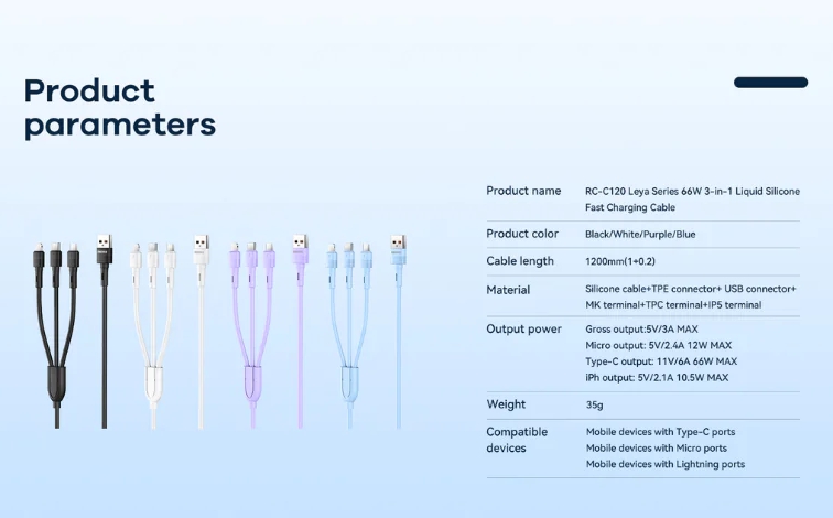 კაბელი Remax RC-C120 Leya Series 66 W 3-in-1 Liquid Silicone Fast Charging Data Cable 1.2m Black