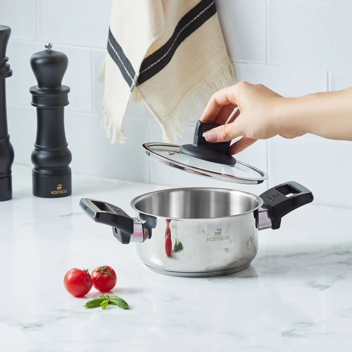 Karaca-ს ეს ვერცხლისფერი ქვაბი დამზადებულია მაღალი ხარისხის უჟანგავი ფოლადისგან. მისი დიამეტრი შეადგენს 16 სმ-ს, ხოლო მოცულობა 1.6 ლ-ს. ქვაბს აქვს ორმაგი ანტიბაქტერიული ფენა, რომელიც არ წარმოქმნის ტოქსიკურ ნივთიერებებს და ხელს უშლის საკვების ზედაპირზე მიკრობას. სახელური დამზადებულია ბაკელიტისგან, რაც მზადების პროცესს უფრო კომფორტულს ხდის.