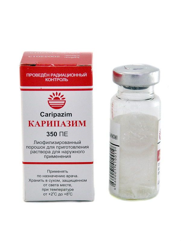 დამწვრობებზე და ინფიცირებულ ჭრილობებში კარიპაზიმს იყენებენ ხსნარების სახით, კონცენტრაციით 17,5 პე/მლ, 35 პე/მლ და 70 პე/მლ ფუფხის სისქის შესაბამისად. ხსნარები მზადდება ხმარების წინ, 0,5 % ნოვოკაინის ან ნატრიუმის ქლორიდის იზოტონურ ხსნარებზე. პრეპარატის ხსნარით გაჟღენთილ საფენს ადებენ დამწვრობის ზედაპირზე და ტენგაუმტარ ნახვევს აფარებენ. ერთდროულად სხეულის ზედაპირის არა უმეტეს 30 % ამუშავებენ. ნახვევს უცვლიან ორ დღეში ერთხელ ან დღე-ღამეში, ამასთან აშორებენ დანეკროზებულ ქსოვილებს. მკურნალობის კურსი 4 - 12 დღე.