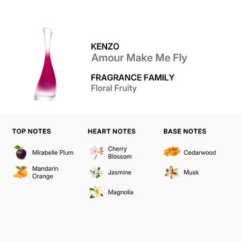 Part of the Floral Fruity fragrance family, Amour Make Me Fly opens with the playful sweetness of mirabelle plum and the bright sparkle of mandarin orange. As the scent unfolds, it blossoms into a graceful heart of cherry blossom, jasmine, and magnolia—creating a bouquet that’s both delicate and radiant. The base settles into warm cedarwood and cozy musk, leaving a lasting impression that’s soft, sensual, and beautifully feminine.