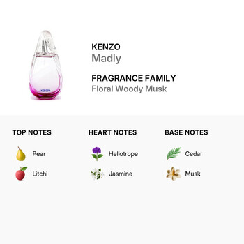 At first spritz, Kenzo Madly opens with the sweet, juicy scent of ripe pear, offering a fresh and inviting introduction. As it settles, the heart reveals a romantic bouquet of jasmine and heliotrope—two soft floral notes that add warmth and depth. Finally, a touch of woody undertones brings balance and sophistication, making this scent perfect for both daytime charm and evening elegance.