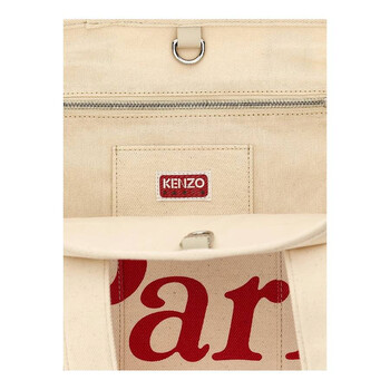 Kenzo Men's Tote. SKU: FE58SA911F35-3. Color: Beige. Kenzo Printed Logo Tote Bag. This tote bag features cotton canvas with two flat shoulder straps, a logo print on the front, and a slogan print on the rear. It has a main compartment and an internal zip-fastening pocket. 100% cotton. Made in China.