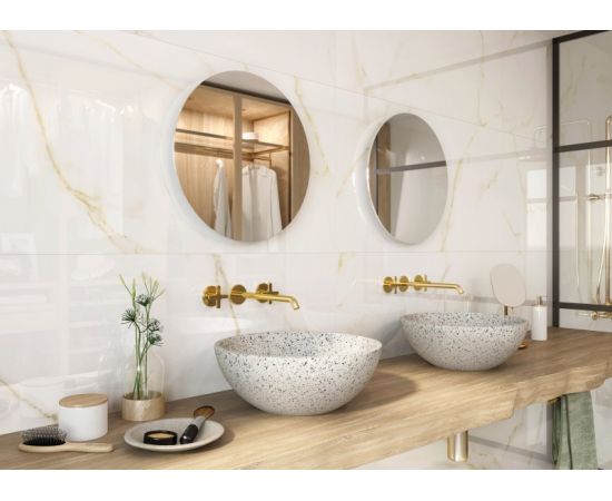 ესპანური კერამიკული ფილა Halcon Ceramicas, რომლის წყალობითაც პატარა სივრცეები უფრო ფართოდ გამოიყურება და ქმნის უწყვეტობის ეფექტს.