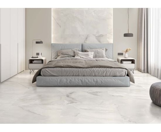 ესპანური კერამიკული ფილა Halcon Ceramicas, რომლის წყალობითაც პატარა სივრცეები უფრო ფართოდ გამოიყურება და ქმნის უწყვეტობის ეფექტს.