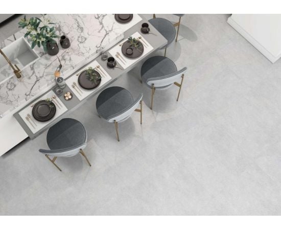 ესპანური კერამიკული ფილა Halcon Ceramicas, რომლის წყალობითაც პატარა სივრცეები უფრო ფართოდ გამოიყურება და ქმნის უწყვეტობის ეფექტს.