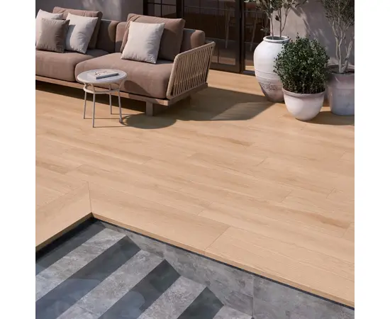 ესპანური კერამიკული ფილა Halcon Ceramicas, რომლის წყალობითაც პატარა სივრცეები უფრო ფართოდ გამოიყურება და ქმნის უწყვეტობის ეფექტს.