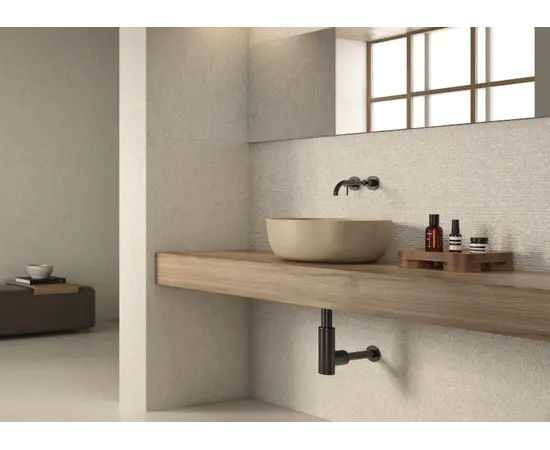 ესპანური კერამიკული ფილა Halcon Ceramicas, რომლის წყალობითაც პატარა სივრცეები უფრო ფართოდ გამოიყურება და ქმნის უწყვეტობის ეფექტს.