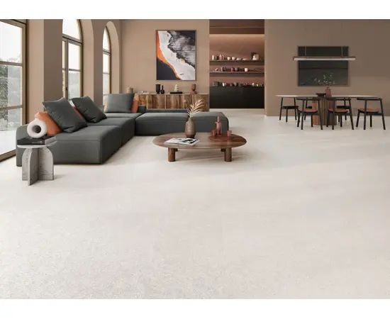 ესპანური კერამიკული ფილა Halcon Ceramicas, რომლის წყალობითაც პატარა სივრცეები უფრო ფართოდ გამოიყურება და ქმნის უწყვეტობის ეფექტს.