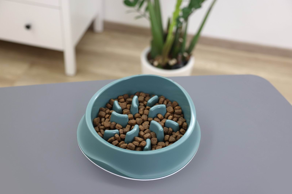 სპეციალური დიზაინი: თასის შიგნით არსებული ამაღლებები ხელს უშლის ცხოველს საკვების სწრაფად მიღებაში, რაც ეხმარება ნელა ჭამაში.