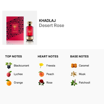 Desert Rose opens with a sparkling burst of blackcurrant, lychee, and orange—an inviting trio that adds a juicy, fruity brightness to the first impression. As the fragrance unfolds, a graceful bouquet of freesia, peach, and rose reveals itself, wrapping you in a soft, romantic heart that feels both fresh and timeless. Finally, the base notes offer a smooth, lasting finish with hints of caramel, musk, and patchouli, adding depth and mystery to this captivating scent.