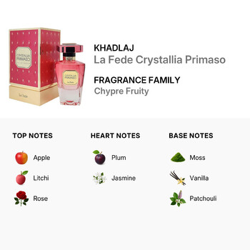 Discover the enchanting allure of Khadlaj's La Fede Crystallia Primaso, a luxurious fragrance meticulously crafted for ladies who seek elegance and sophistication. This exquisite scent is a part of the Chypre Fruity fragrance family, offering a captivating blend of vibrant and sensual notes that will leave a lasting impression.