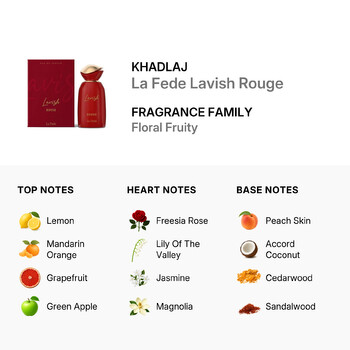 La Fede Lavish Rouge opens with a refreshing burst of top notes that harmoniously blend zesty lemon, mandarin orange, and grapefruit, with the crispness of green apple and the invigorating essence of marine aspic. As the fragrance evolves, the heart notes reveal a romantic bouquet of freesia rose, lily of the valley, jasmine, magnolia, and a hint of orange tree. These floral notes weave together to create a feminine and enchanting symphony that captivates the senses.