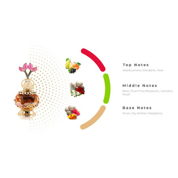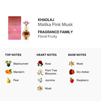 The top notes of Malika Pink Musk reveal a delightful blend of blackcurrant, mandarin, and pear, offering a fresh and fruity opening that invigorates the senses. As the fragrance unfolds, the heart notes bloom with the romantic essence of rose, plum tree blossoms, and jasmine, intertwined with hints of musk, creating a floral bouquet that's both sophisticated and enchanting.