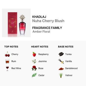 From the very first spray, Nuha Cherry Blush reveals a bold and fruity opening with top notes of sweet cherry, smooth rum, and deep red wine. These intoxicating scents set the stage for a heart that flourishes with romantic rose, delicate jasmine, juicy raspberry, soft orris, and warm cedar. The fragrance then settles into a luxurious base of creamy tonka, comforting vanilla, earthy vetiver, sensual musk, labdanum, and soft sandalwood, creating a long-lasting and irresistible finish.