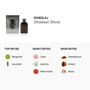 Discover the captivating allure of Khadlaj's Ghadeer Silver, a unisex fragrance that transcends the ordinary. This exquisite scent, crafted in the heart of the United Arab Emirates, embodies the essence of Middle Eastern opulence. Perfectly balanced for any occasion, Ghadeer Silver invites you to experience a world of elegance and sophistication.