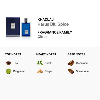 Kadlaj's Karus Blu Spice opens with the invigorating top notes of tea and bergamot, setting a refreshing and lively tone. As the fragrance unfolds, the heart notes of neroli and ginger infuse a warm, spicy charm that enchants the senses. The journey concludes with a rich and comforting base of cinnamon and guaiacwood, leaving a lasting impression that is both sophisticated and inviting.