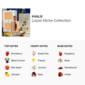 Khalis Layan Niche Collection is a signature Eau de Parfum Spray that combines quality ingredients with expert craftsmanship. Inspired by the rich heritage of Middle Eastern perfumery, this ladies’ fragrance delivers long-lasting performance and a refined scent profile that stands out. Whether you're heading to a special event or simply want to feel confident every day, Layan is your perfect scent companion.