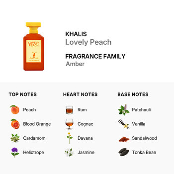 From the very first moment, Lovely Peach delights with sweet top notes of juicy peach and blood orange, balanced perfectly by the warm spice of cardamom and the soft floral touch of heliotrope. As the fragrance unfolds, heart notes of rum and cognac bring a smooth, sophisticated twist, while davana and jasmine add a soft, romantic flair.