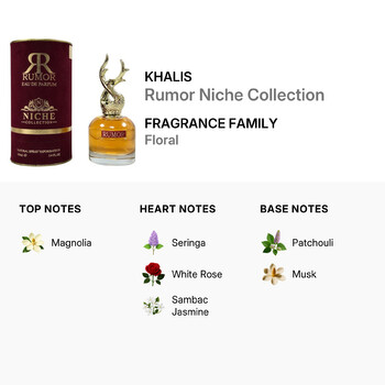 Let your presence speak volumes with Khalis Ladies Rumor Niche Collection EDP Spray—an enchanting blend of floral and musky notes that celebrates the spirit of femininity. This fragrance is only available for shipment within the Contiguous United States and Canada. Barcode: 6290360812533.