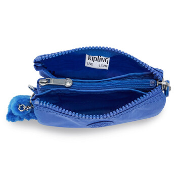 Kipling Ladies Pouch. SKU: KPK01864JC71. Barcode: 195436942212. Color: Blue. Size: 14.5 Width x 4 Depth x 9.5 Height cm. Kipling Creativity S Small Pouch. This pouch features three pockets within a zippered main compartment, offering secure storage for coins, notes, and cards. It is finished with the round Kipling logo and a Kipling monkey ring for added flair. 56% Recycled Polyamide, 44% Polyamide.