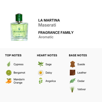 Maserati opens with a vibrant mix of cypress, bergamot, and mandarin orange, creating a crisp and energetic introduction. The heart reveals a unique blend of sage, daisy, and angelica, adding a touch of herbal depth with a hint of floral charm. Finally, the base notes of suede, leather, cedar, and vetiver bring warmth and masculinity, grounding the scent with a confident finish.