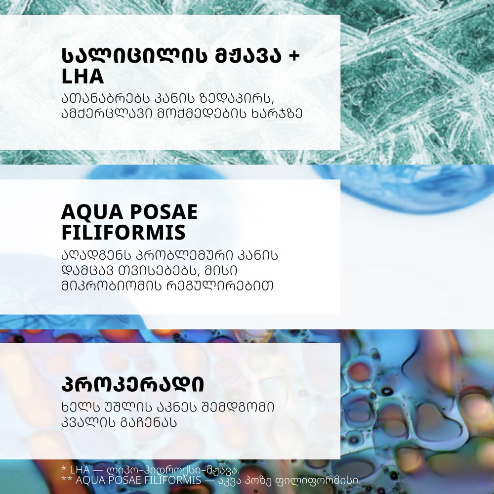 განკუთვნილია ცხიმიანი პრობლემური კანისთვის, რომელიც მიდრეკილია აკნესკენ. ფორმულაში შემავალი სალიცილის მჟავა ქერცლავს და ანიჭებს კანს ერთგვაროვან იერს. აღადგენს პრობლემური კანის დამცავ თვისებებს, მისი მიკრობიომის რეგულირებით. ამცირებს შავ წერტილებს, გაფართოებულ ფორებს და ხელს უშლის მუქი ლაქების წარმოქმნას. იცავს UVA/UVB სხივებისგან და გარემოს მავნე ზემოქმედებისგან. არ შეიცავს ეთილის სპირტსა და მინერალურ ზეთებს. არ ხურავს ფორებს და არ ტოვებს თეთრ ლაქებს. რეკომენდირებულია მისი გამოყენება როგორც მაკიაჟის ბაზა.