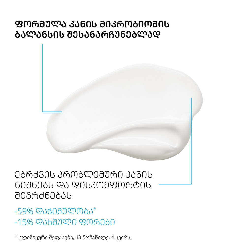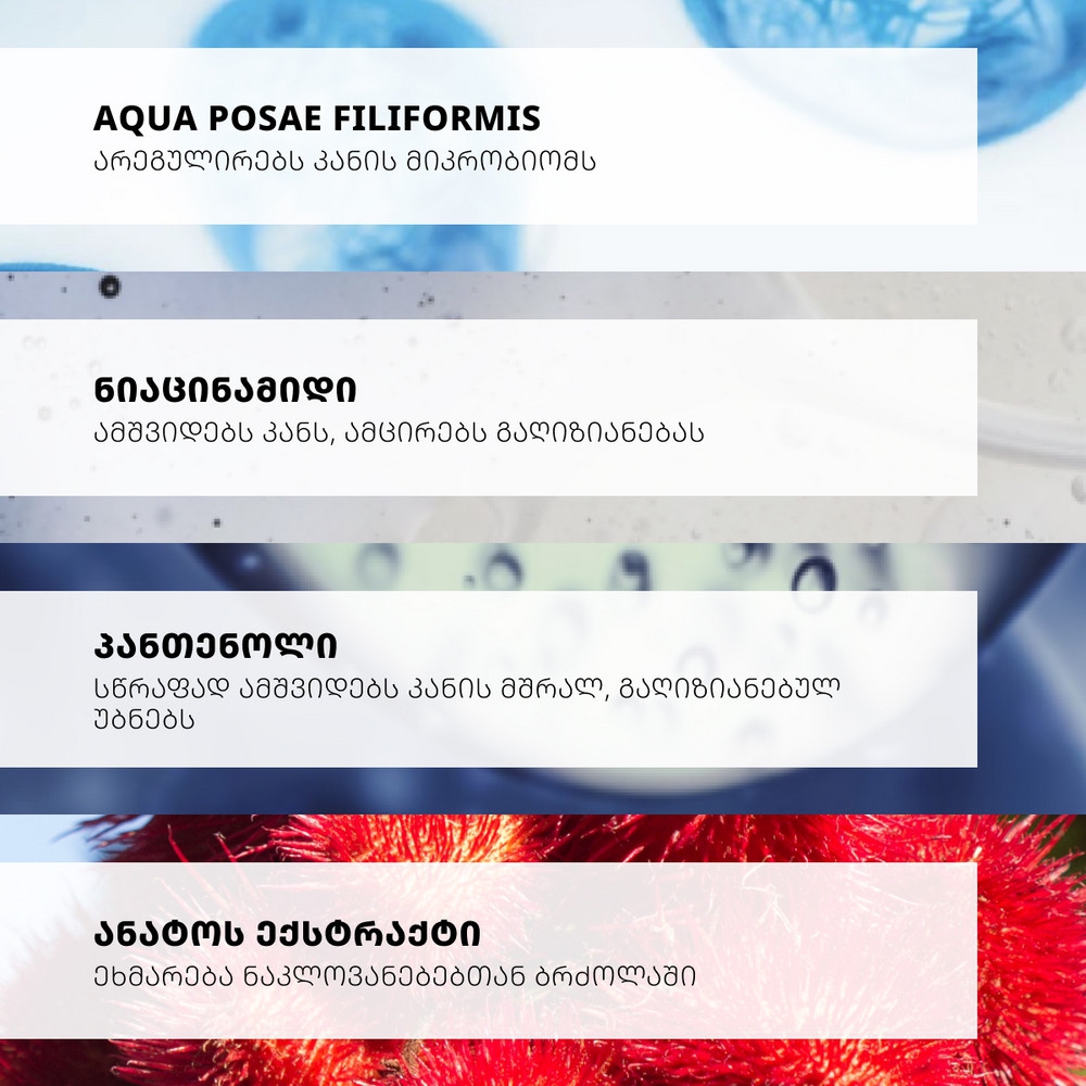 განკუთვნილია აკნესადმი მიდრეკილი, ცხიმიანი და პრობლემური კანისთვის, რომელიც გამომშრალია მედიკამენტური მკურნალობის შემდეგ. ექსკლუზიური აქტიური ინგრედიენტი ხელს უწყობს ეპიდერმისის მიკრობიომის რეგულირებასა და მის ზედაპირზე სასარგებლო ბაქტერიების შენარჩუნებას. ფორმულაში შემავალი ნიაცინამიდი და პანთენოლი მყისიერად ამშვიდებს და ამცირებს გაღიზიანებას. კანი ხდება ნაკლებად ცხიმიანი.